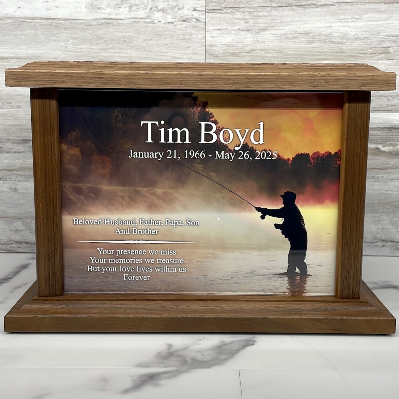 A true fisherman enjoys the process of fishing. It's not just about the catch, it's also about the experience. A magnificent sunset is a reward in itself. Our Fisherman III Prestige Walnut Urn is a part of our top tier selection of products, and beautifully captures the essence of the fisherman's perfect sunset in a high resolution image that can also feature your custom text.