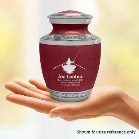 Select Fishing Boat Sharing Urn - Rose Red to create a personal memorial that is a step larger than a keepsake urn but more petite than a full size urn. Bold, attractive colors offer sharp contrast with the engraved text and detailed artwork.