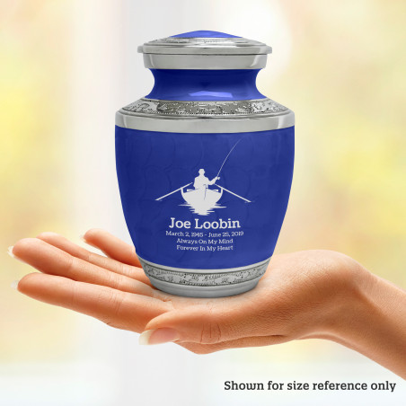 Select Fishing Boat Sharing Urn - Royal Blue to create a personal memorial that is a step larger than a keepsake urn but more petite than a full size urn. Bold, attractive colors offer sharp contrast with the engraved text and detailed artwork.