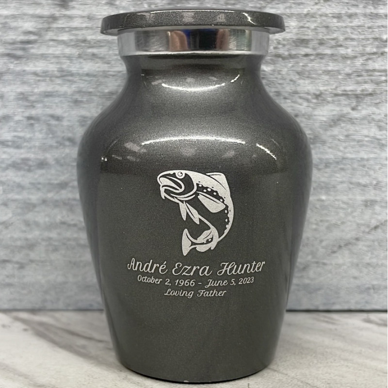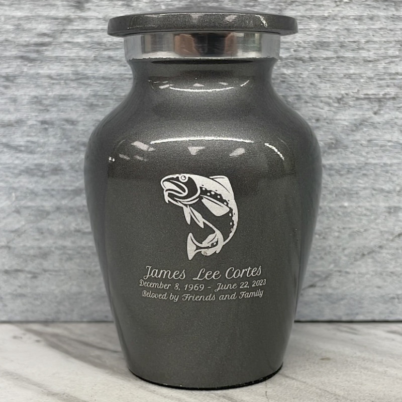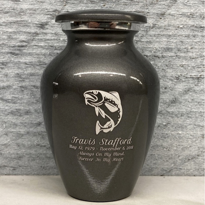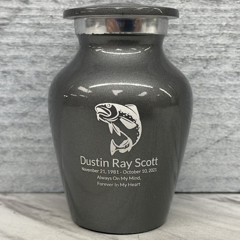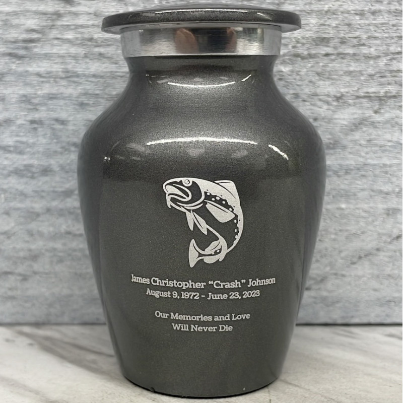 Choose the Gunmetal Gray Fishing Keepsake Cremation Urn to create a personal memorial for a loved one who always wanted to be out on the water, chasing that next big catch. Customize the urn with special engraving for each family member or close friend, creating memorials for each to hold close.