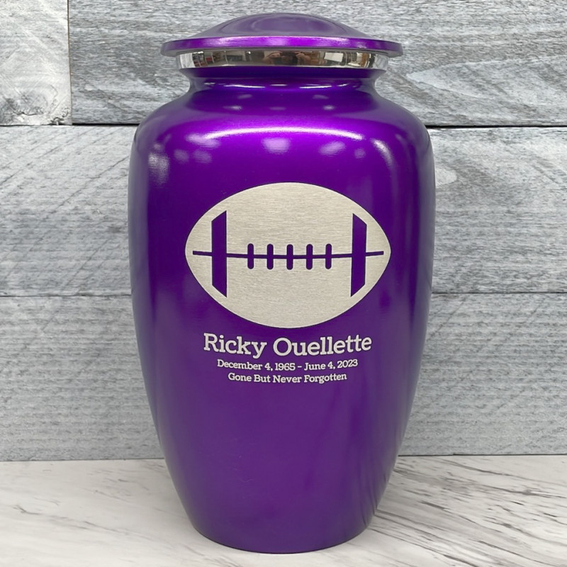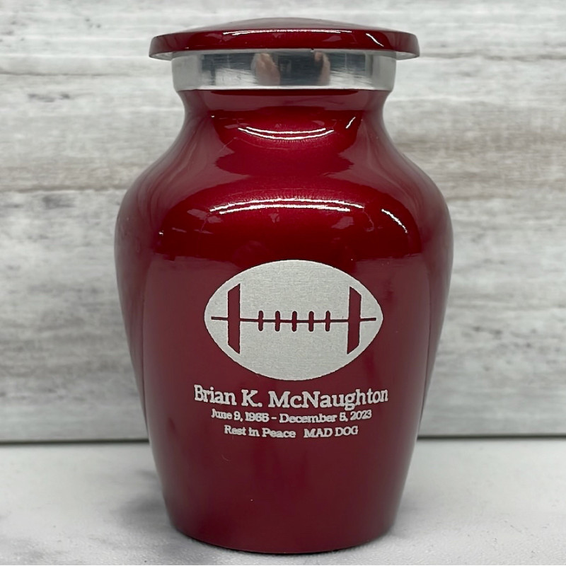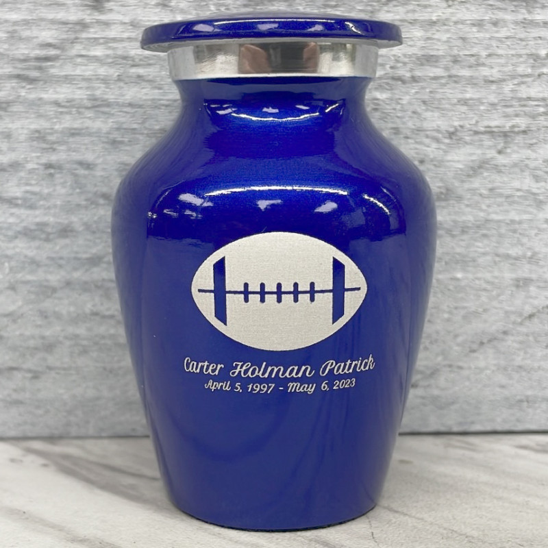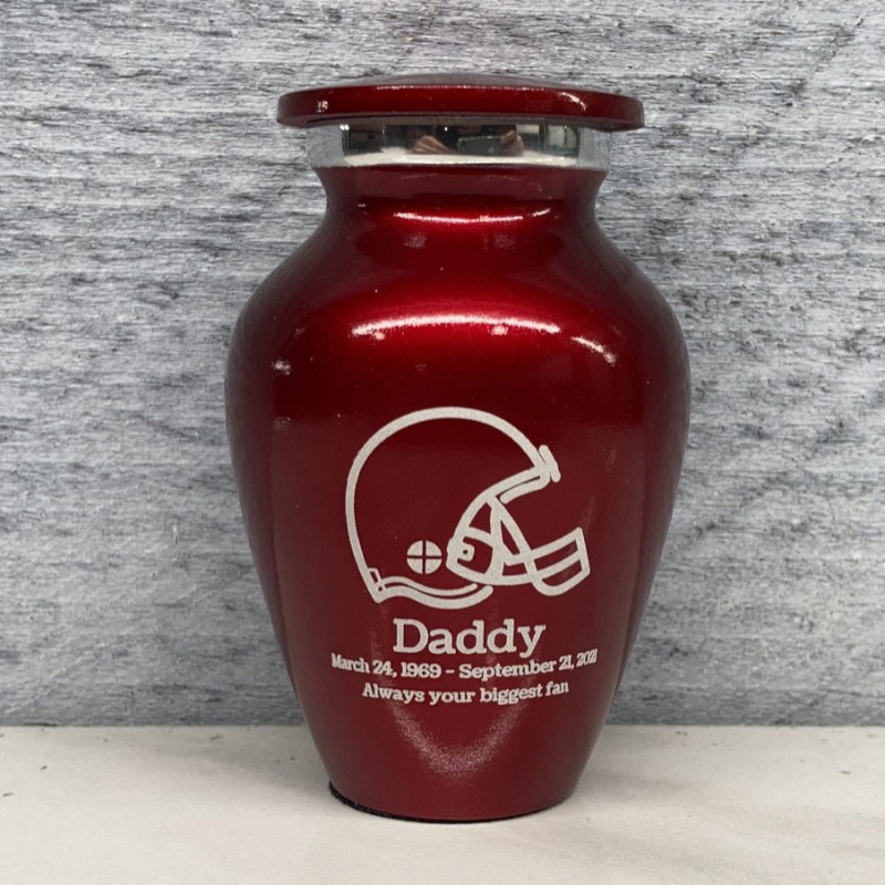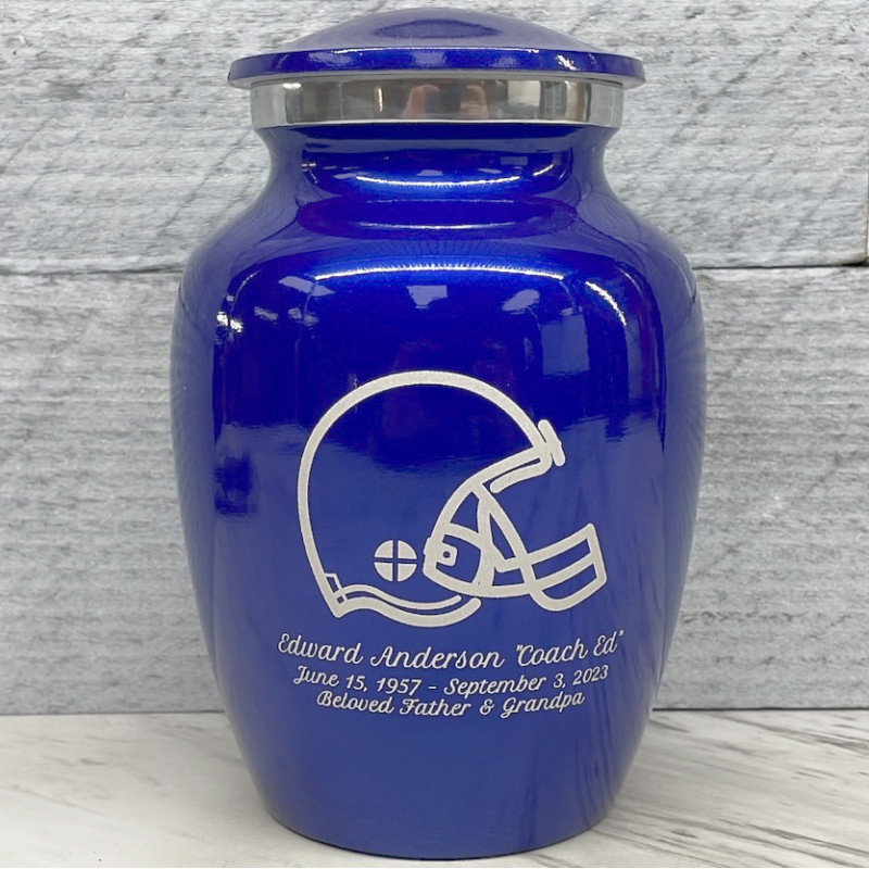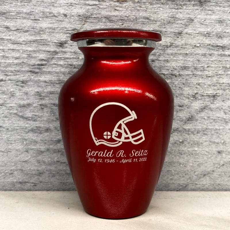 Choose a Football Helmet Keepsake Urn to create an intimate and personal memorial for family members or close friends. Bold, attractive colors offer sharp contrast with the engraved text and artwork.