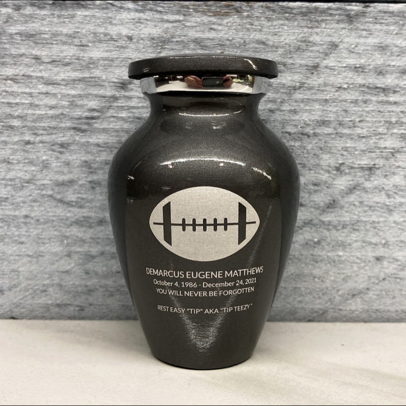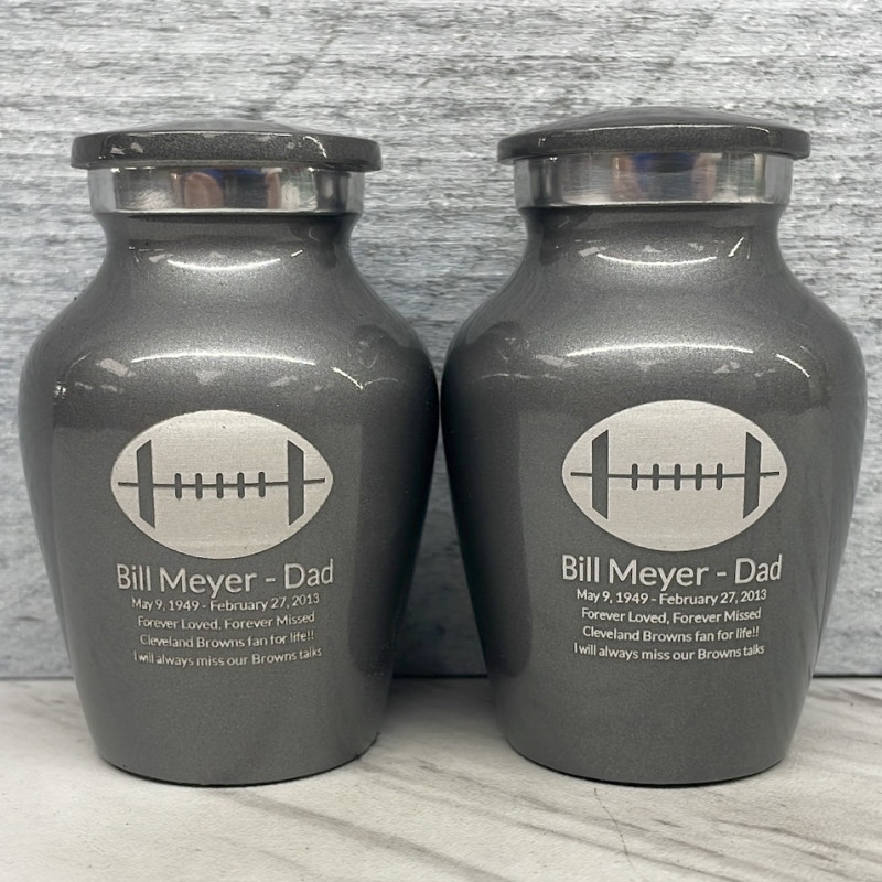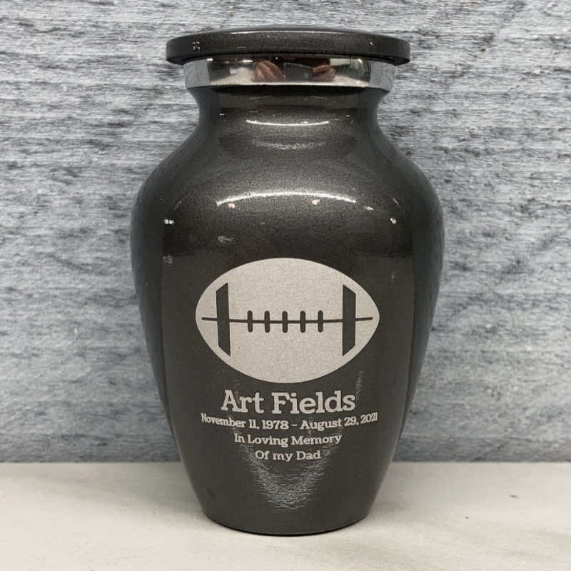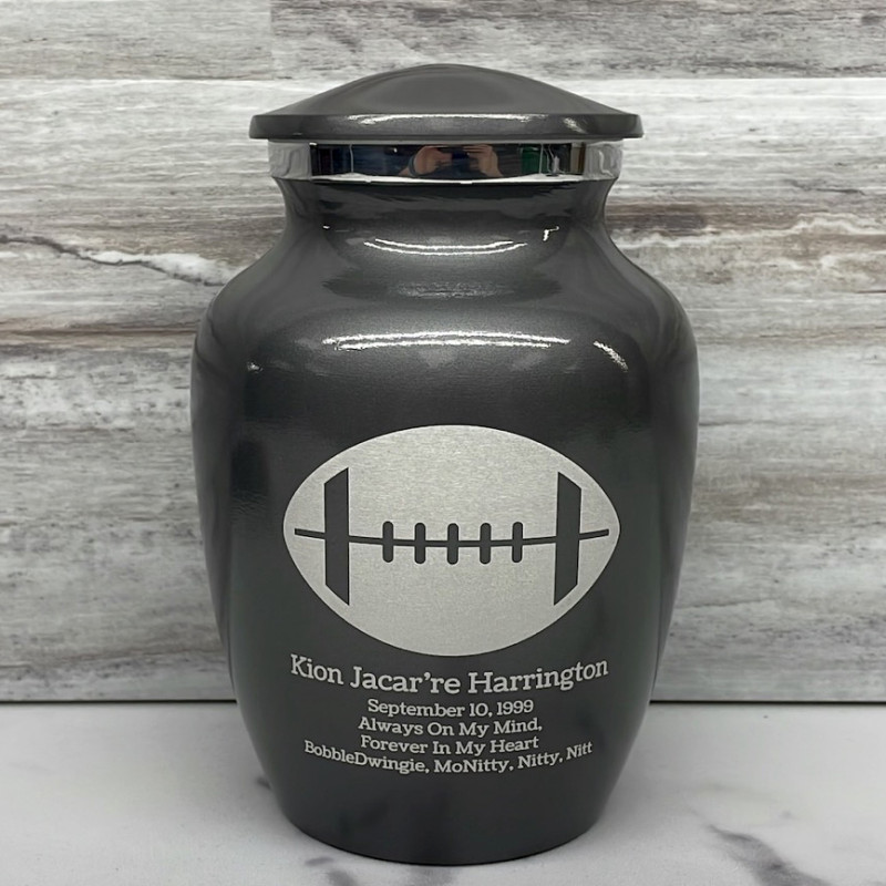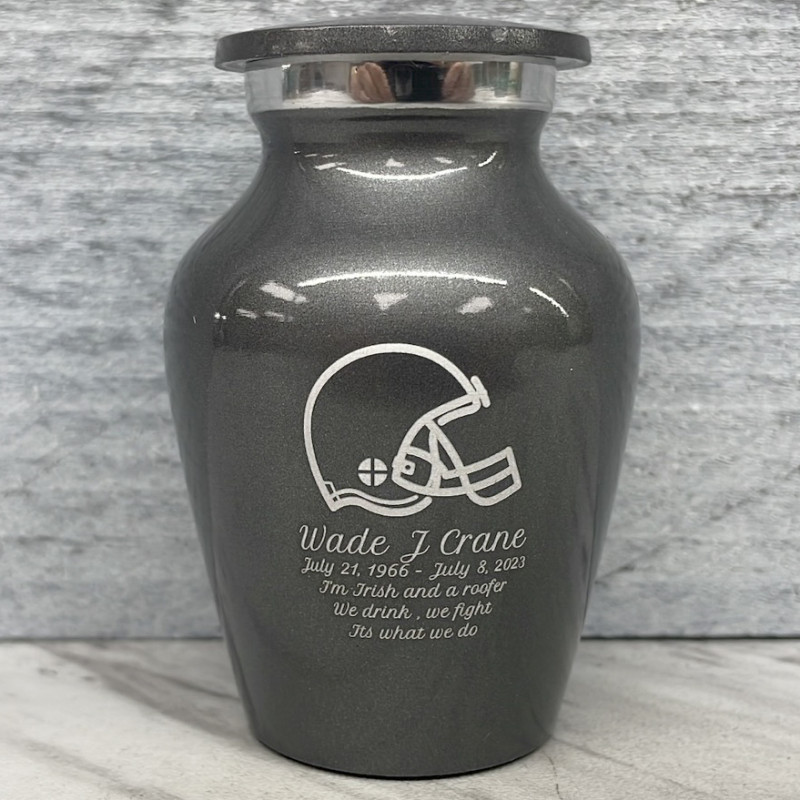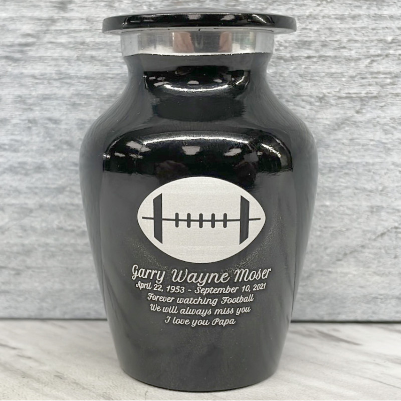 Choose a Football Helmet Keepsake Urn to create an intimate and personal memorial for family members or close friends. Bold, attractive colors offer sharp contrast with the engraved text and artwork.