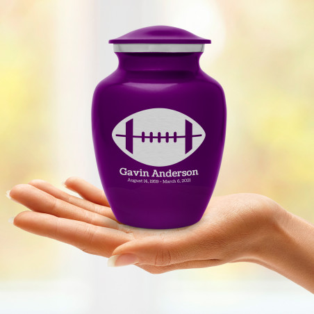 The Purple Luster Football Helmet Sharing Cremation Urn memorializes your loved ones passion for the America's greatest game. An outstanding value that allows everyone in the family to have a memorial of their own, optional engraving front and back there are many ways to make the urn unique to your loved one. A threaded lid and felt base ensure it securely closes and protects display surfaces.