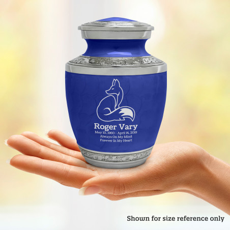 Select Fox II Sharing Urn - Royal Blue to create a personal memorial that is a step larger than a keepsake urn but more petite than a full size urn. Bold, attractive colors offer sharp contrast with the engraved text and detailed artwork.