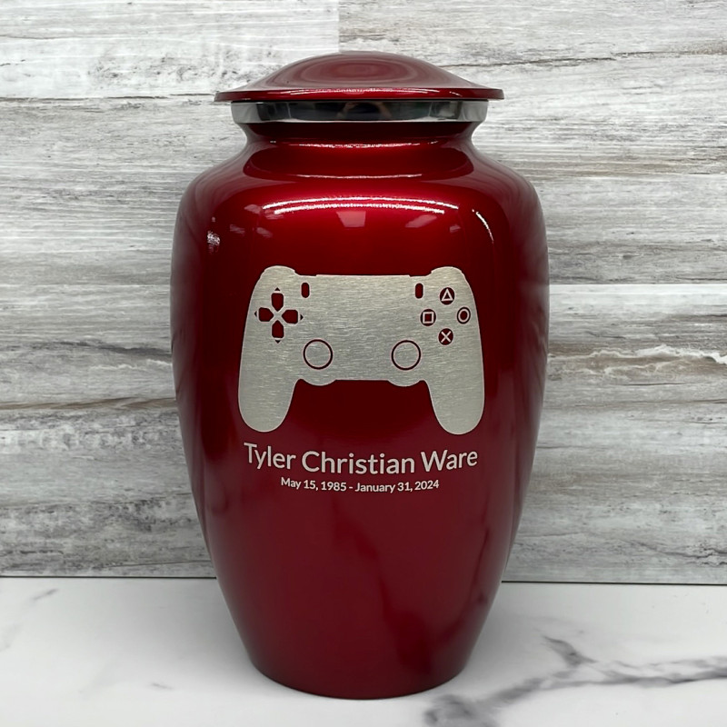 Images don't do this urn justice. My brother was an avid Playstation fan and gaming brought him a lot of relief as he was disabled with MS. He found a lot of peace in escaping into fantasy games and the urn is just so fitting for what made him the happiest. I sincerely appreciate this companies attention to detail and shipping out the urn so fast with engraving. Would highly recommend