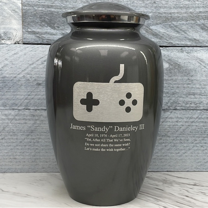 Memorialize the gamer in your life with the Gunmetal Gray Gaming Cremation Urn which is engraved with classic gamepad artwork. Customize the urn with special, optional engraving front and back. Using the guided personalization process, it is possible to choose from suggested sentiments or poems or create your own.