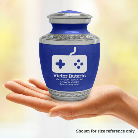 Select Gaming Sharing Urn - Royal Blue to create a personal memorial that is a step larger than a keepsake urn but more petite than a full size urn. Bold, attractive colors offer sharp contrast with the engraved text and detailed artwork.