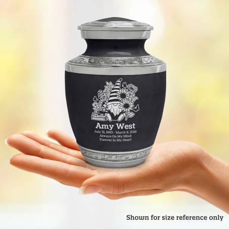 Select Garden Gnome Sharing Urn - Ebony Black to create a personal memorial that is a step larger than a keepsake urn but more petite than a full size urn. Bold, attractive colors offer sharp contrast with the engraved text and detailed artwork.