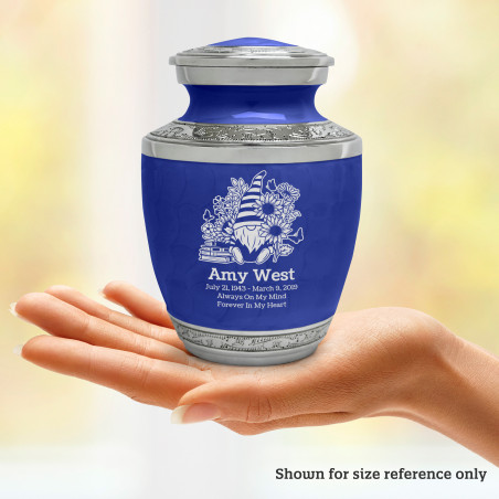 Select Garden Gnome Sharing Urn - Royal Blue to create a personal memorial that is a step larger than a keepsake urn but more petite than a full size urn. Bold, attractive colors offer sharp contrast with the engraved text and detailed artwork.
