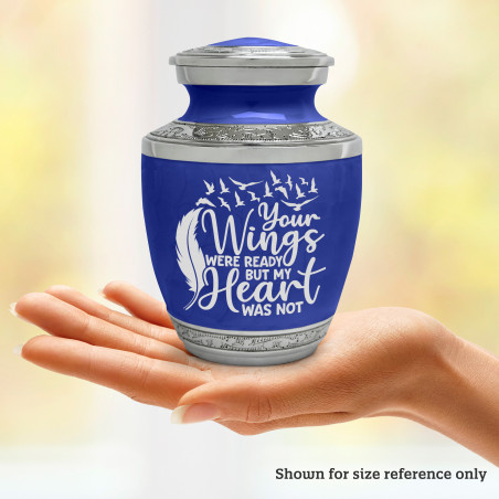 Select Going Home Sharing Urn - Royal Blue to create a personal memorial that is a step larger than a keepsake urn but more petite than a full size urn. Bold, attractive colors offer sharp contrast with the engraved text and detailed artwork.