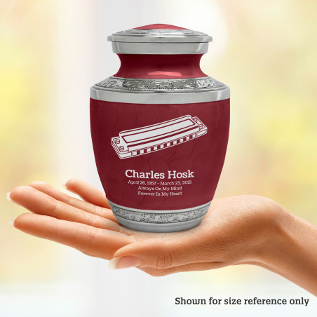 Select Harmonica Sharing Urn - Rose Red to create a personal memorial that is a step larger than a keepsake urn but more petite than a full size urn. Bold, attractive colors offer sharp contrast with the engraved text and detailed artwork.