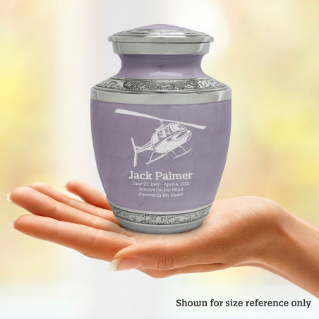 Select Helicopter Sharing Urn - Regal Purple to create a personal memorial that is a step larger than a keepsake urn but more petite than a full size urn. Bold, attractive colors offer sharp contrast with the engraved text and detailed artwork.