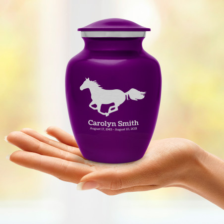 Remember your loved one and their passion for all things equine with the Purple Luster Horse Sharing Cremation urn. It's a great value that allows everyone in the family to have a memorial of their own engraved with an incredible galloping horse silhouette. With optional engraving front and back it can be made unique to your loved one. A threaded lid and felt base ensure it securely closes and protects display surfaces.