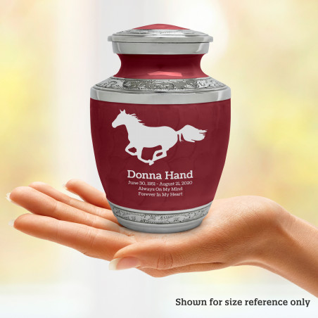 Select Horse Sharing Urn - Rose Red to create a personal memorial that is a step larger than a keepsake urn but more petite than a full size urn. Bold, attractive colors offer sharp contrast with the engraved text and detailed artwork.