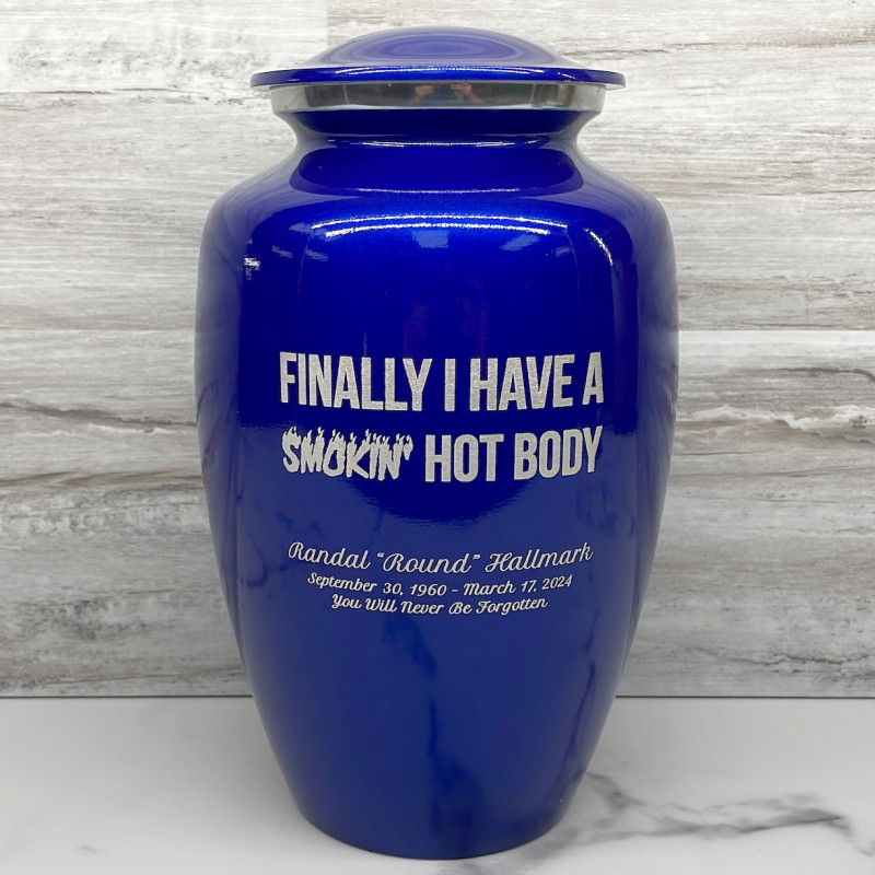 Choose a Hot Body Cremation Urn to create a beautiful memorial that is sized to hold the entire remains of any adult. Bold, attractive colors offer sharp contrast with the engraved text and detailed artwork.