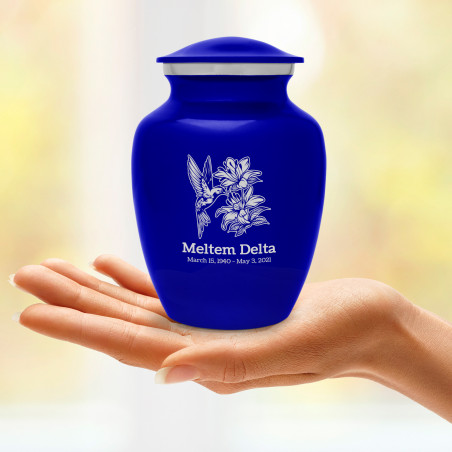 Select a Hummingbird Flowers Sharing Urn to create a personal memorial that is a step larger than a keepsake urn but more petite than a full size urn. Bold, attractive colors offer sharp contrast with the engraved text and detailed artwork.