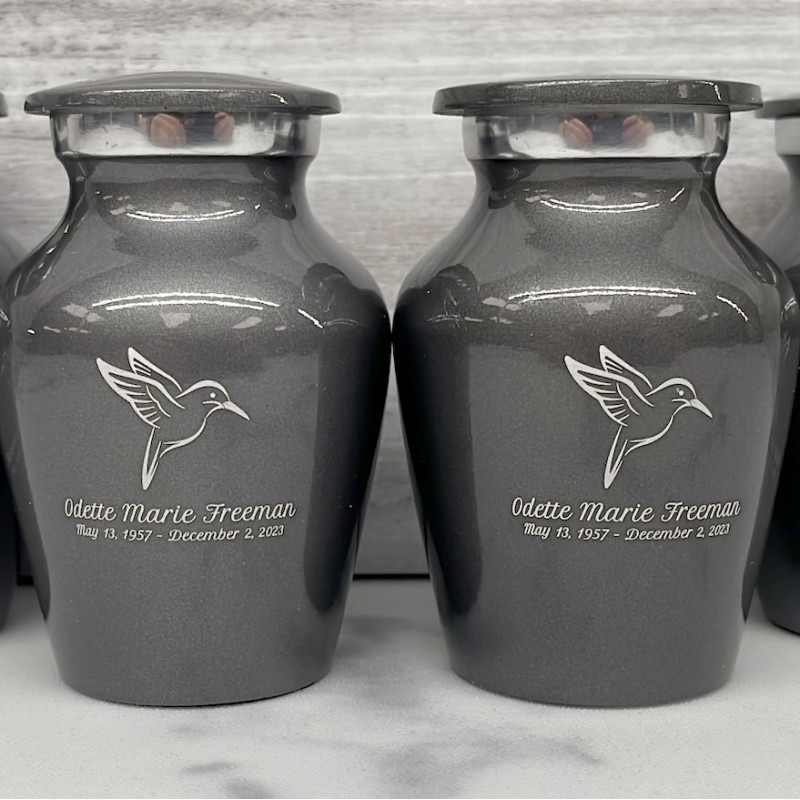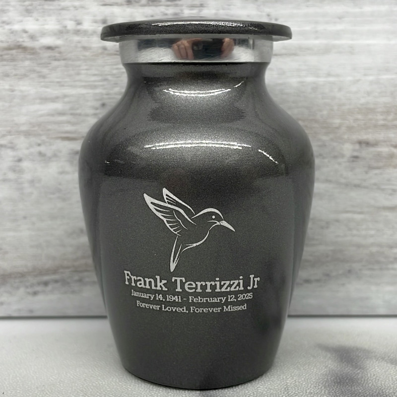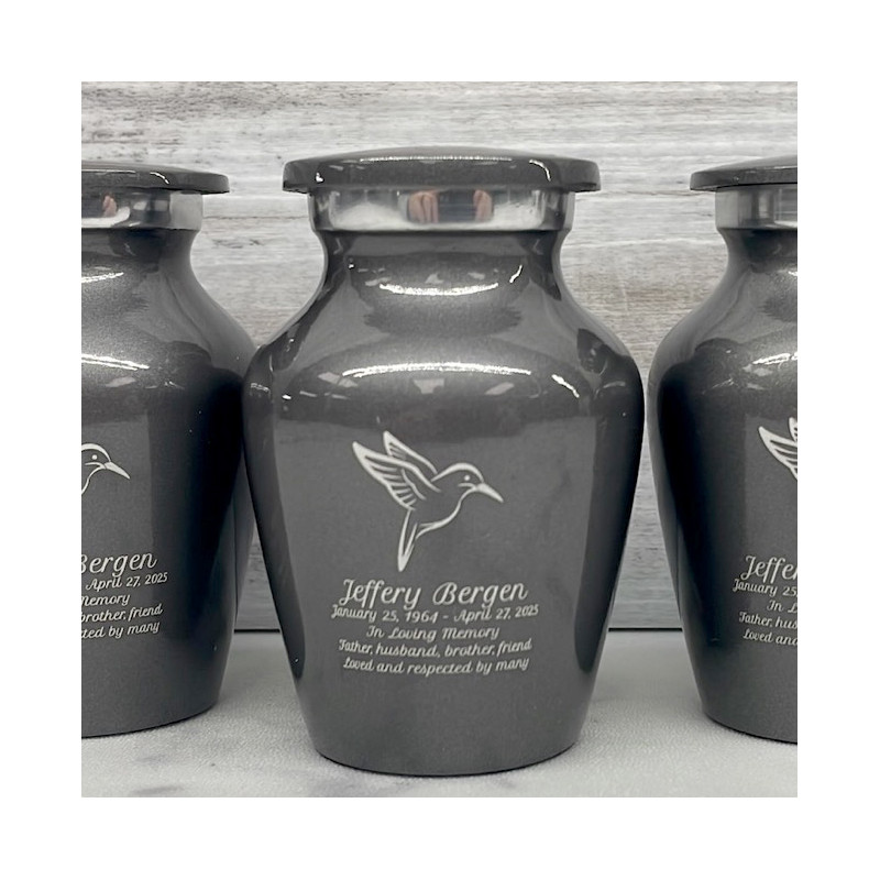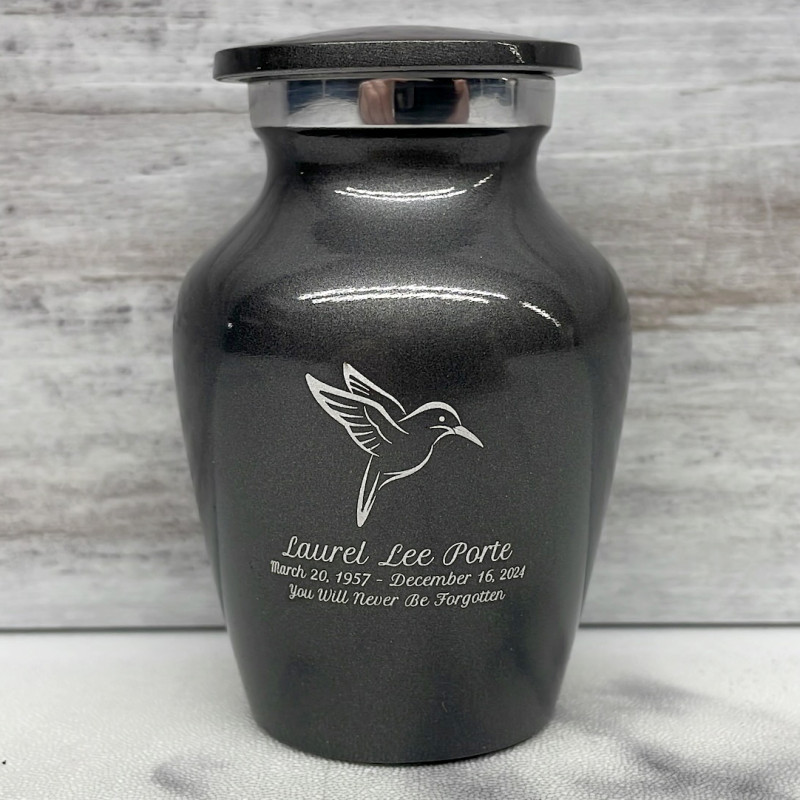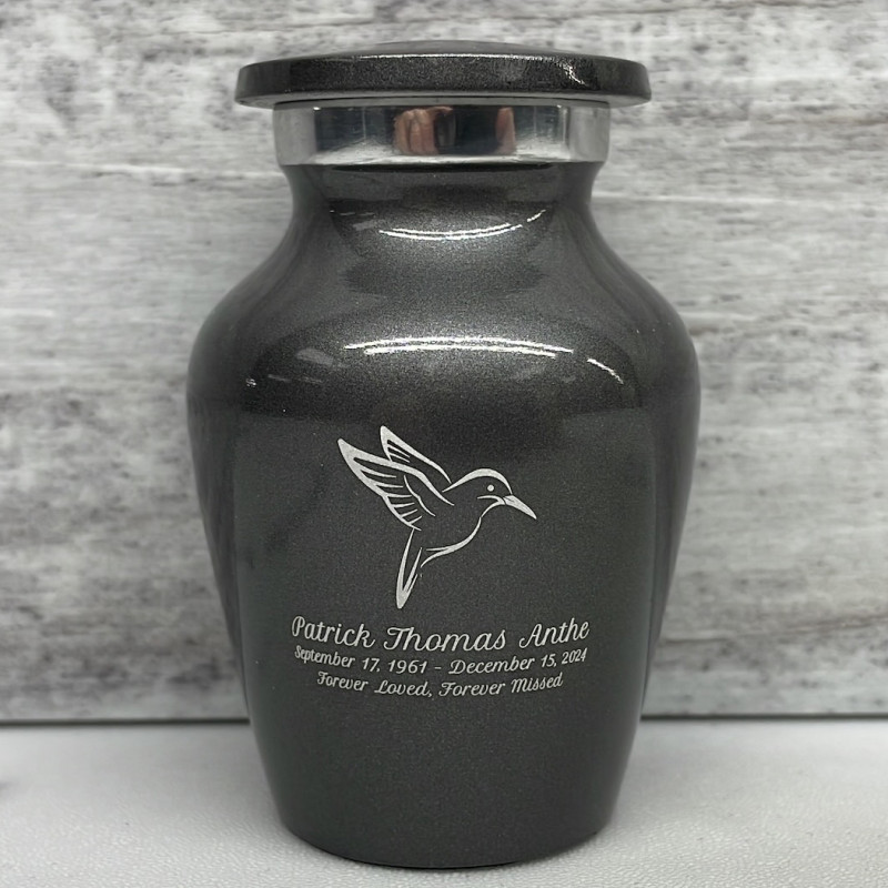 Give the gift of a lasting memorial to every family member with the Gunmetal Gray Hummingbird Keepsake Urn. Small in size, it has full featured engraving including a name line, date line, and sentiment lines when the optional engraving is selected.