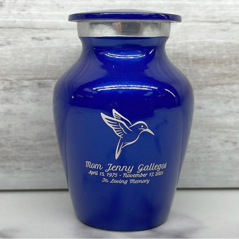 This is a miniature urn that features an engraved hummingbird along with a name, date and room for additional sentiment lines on the front and room for custom engraved text on the back.