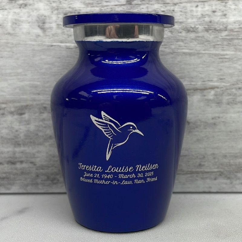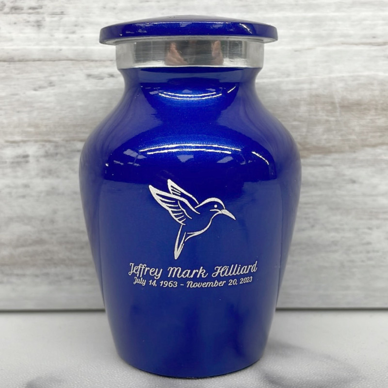 A combination of beauty and value, the Midnight Blue Hummingbird Keepsake Urn makes an attractive companion the individual sized Hummingbird Cremation Urn or stands alone as an option for ensuring each family member has their own memorial.