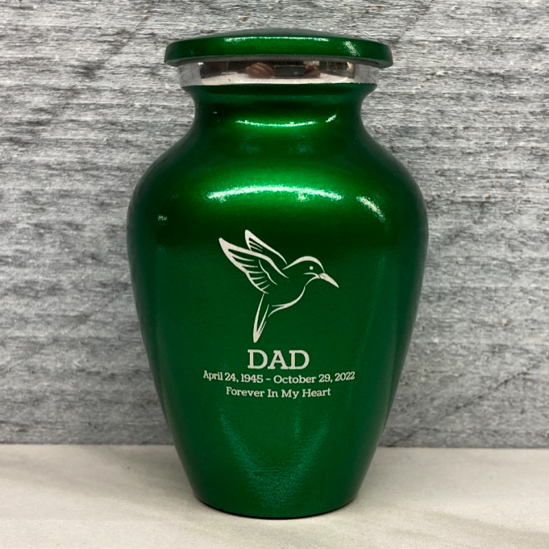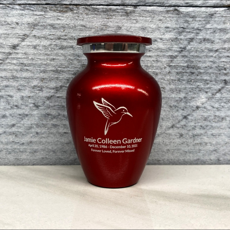 Select a Hummingbird Sharing Urn to create a personal memorial that is a step larger than a keepsake urn but more petite than a full size urn. Bold, attractive colors offer sharp contrast with the engraved text and detailed artwork.
