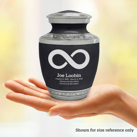 Select Infinity Symbol Sharing Urn - Ebony Black to create a personal memorial that is a step larger than a keepsake urn but more petite than a full size urn. Bold, attractive colors offer sharp contrast with the engraved text and detailed artwork.