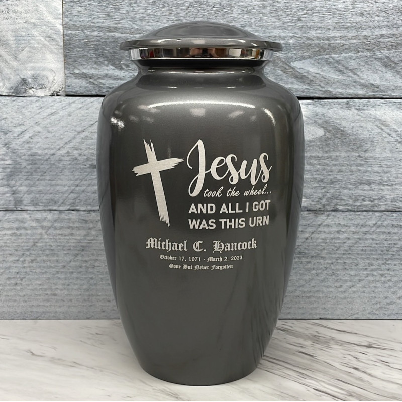 Jesus Took The Wheel Cremation Urn - Gunmetal Gray