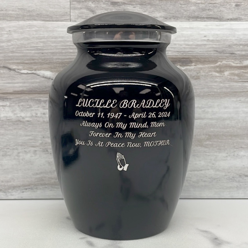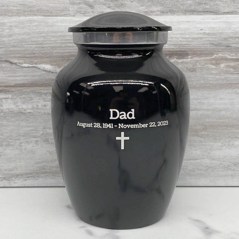 Memorialize your loved one with the Jet Black Sharing Cremation Urn. It's an outstanding value that allows everyone in the family to have a memorial of their own engraved with custom text and selection of one of eight artwork options. With optional engraving front and back it can be made unique to your loved one. A threaded lid and felt base ensure it securely closes and protects display surfaces.