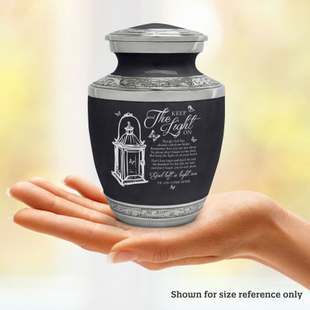 Select Keep the Light On Sharing Urn - Ebony Black to create a personal memorial that is a step larger than a keepsake urn but more petite than a full size urn. Bold, attractive colors offer sharp contrast with the engraved text and detailed artwork.