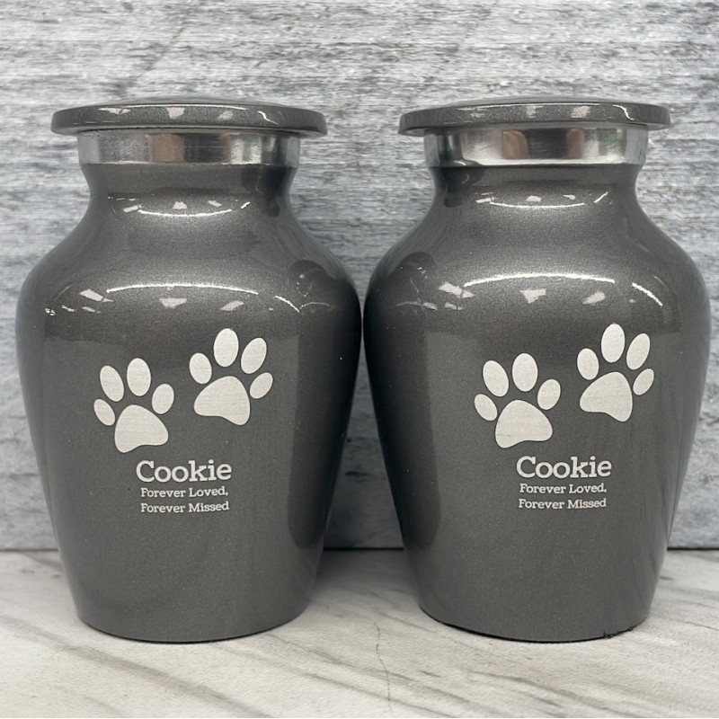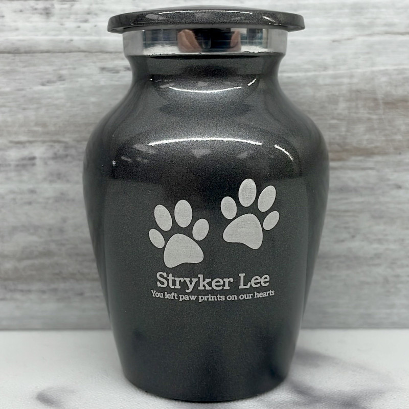 The Gunmetal Gray Keepsake Pawprints Heart Pet Cremation Urn is a handsome way to memorialize your departed pet.