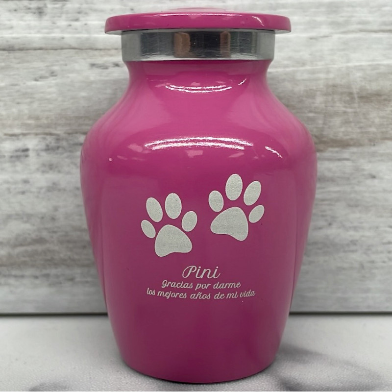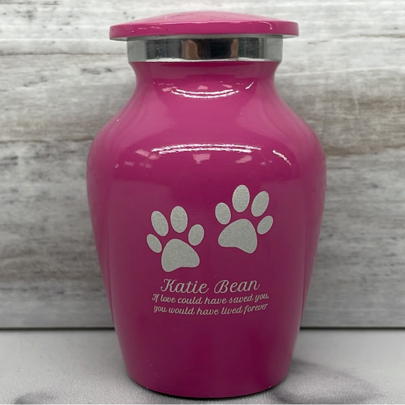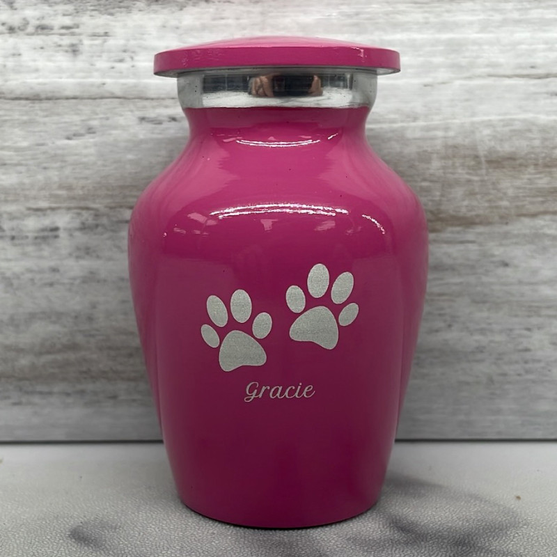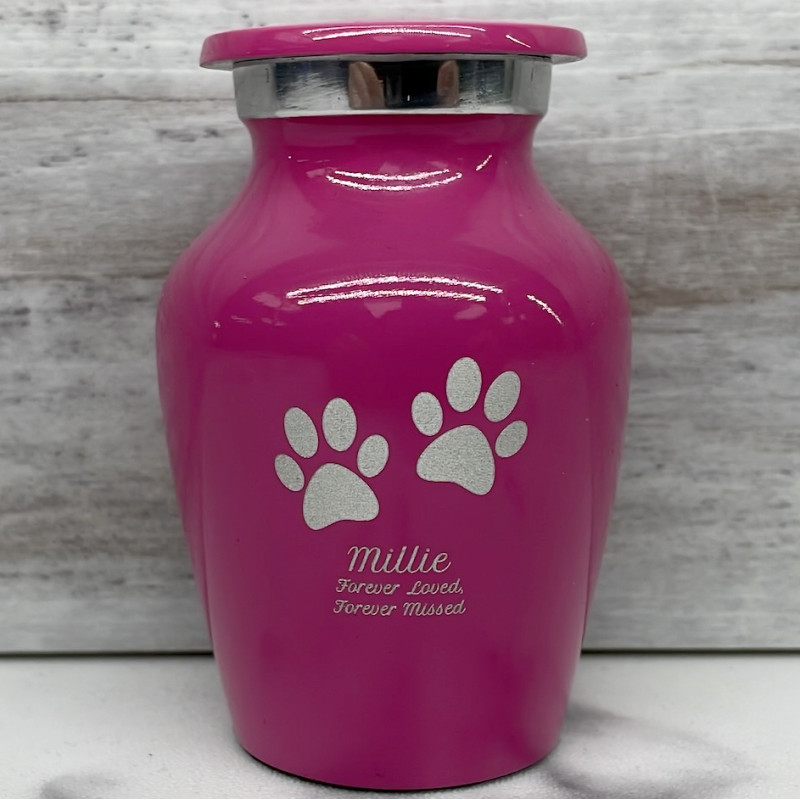 The Keepsake Rose Pink Small Pawprints Keepsake Urn Pet Cremation Urn is an attractive and meaningful way to pay tribute to your pet who has passed on. Optional engraving features a name line and two additional lines that can include dates or sentiment lines. Choose from our most popular sentiments, customize them or enter your own text to make it completely unique.