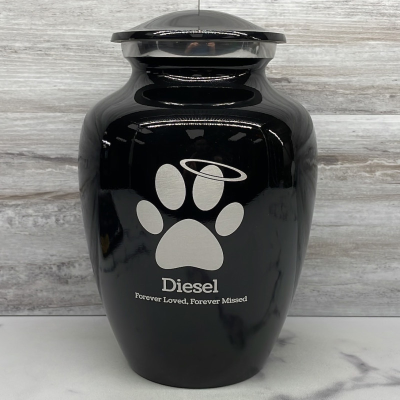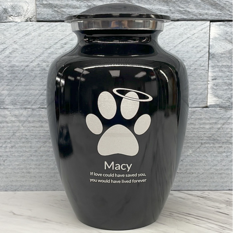 The Large Jet Black Angel Paw Splitting Cremation Urn Pet Cremation Urn is an attractive and meaningful way to pay tribute to your pet who has passed on. Optional engraving features a name line and two additional lines that can include dates or sentiment lines. Choose from our most popular sentiments, customize them or enter your own text to make it completely unique.