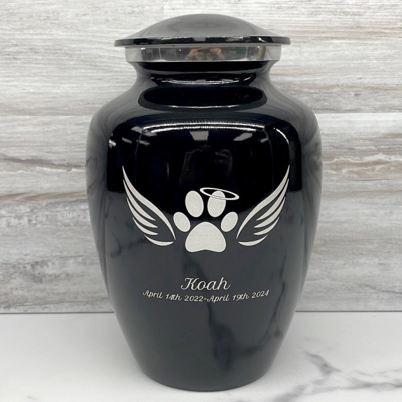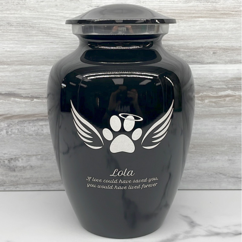 The Large Jet Black Angel Wings Splitting Cremation Urn Pet Cremation Urn is an attractive and meaningful way to pay tribute to your pet who has passed on. Optional engraving features a name line and two additional lines that can include dates or sentiment lines. Choose from our most popular sentiments, customize them or enter your own text to make it completely unique.