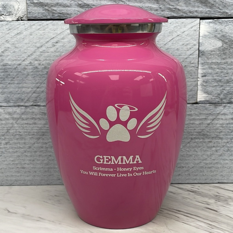 The Large Rose Pink Angel Wings Splitting Cremation Urn Pet Cremation Urn is an attractive and meaningful way to pay tribute to your pet who has passed on. Optional engraving features a name line and two additional lines that can include dates or sentiment lines. Choose from our most popular sentiments, customize them or enter your own text to make it completely unique.