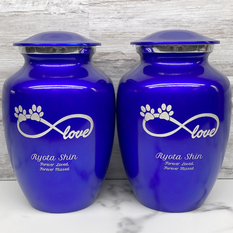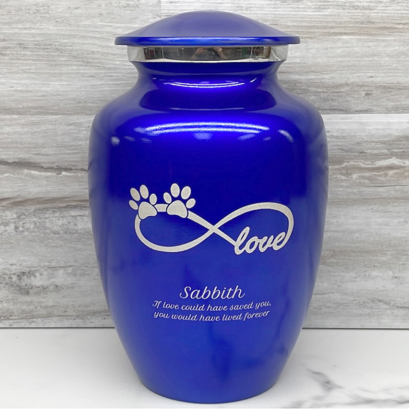 The Large Infinite Love Pet Cremation Urn is an attractive and meaningful way to pay tribute to your pet who has passed on. Optional engraving features a name line and two additional lines that can include dates or sentiment lines. Choose from our most popular sentiments, customize them or enter your own text to make it completely unique.