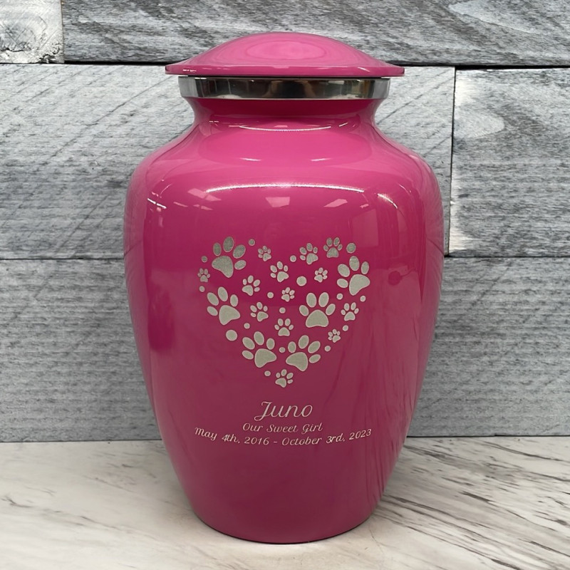 The Large Rose Pink Pawprint Heart Pet Cremation Urn is an attractive and meaningful way to pay tribute to your pet who has passed on. Optional engraving features a name line and two additional lines that can include dates or sentiment lines. Choose from our most popular sentiments, customize them or enter your own text to make it completely unique.