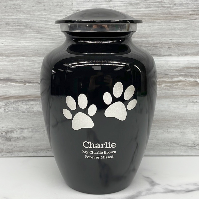 The Large Jet Black Small Pawprints Splitting Cremation Urn Pet Cremation Urn is an attractive and meaningful way to pay tribute to your pet who has passed on. Optional engraving features a name line and two additional lines that can include dates or sentiment lines. Choose from our most popular sentiments, customize them or enter your own text to make it completely unique.