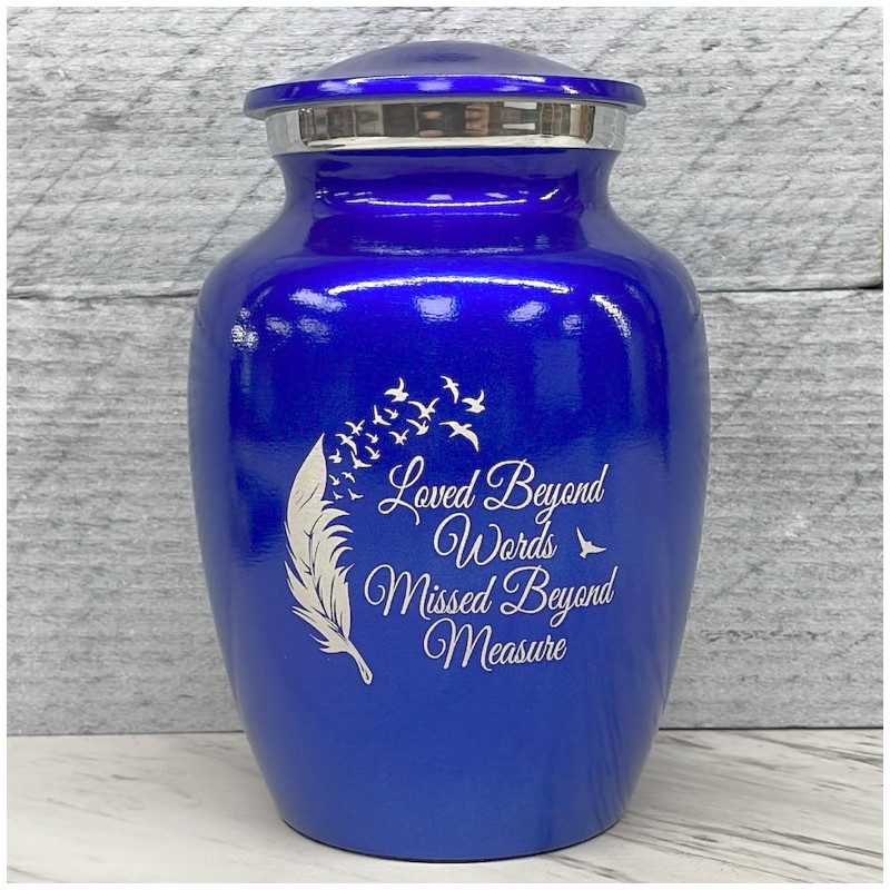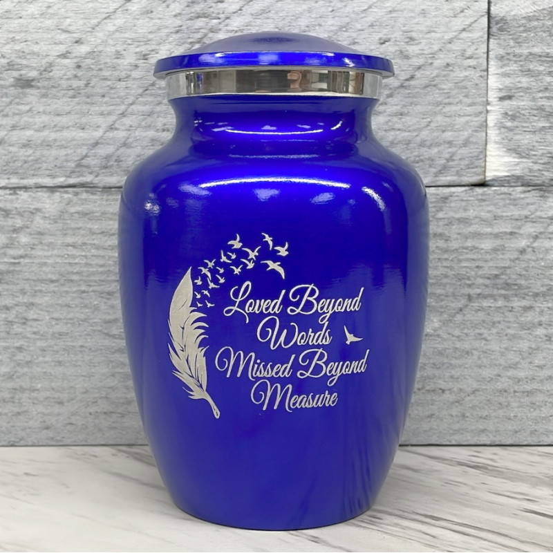 Select an engraved sharing urn to create a personal memorial that is a step larger than a keepsake urn but more petite than a full size urn. Bold, attractive colors offer sharp contrast with the engraved text and detailed artwork.