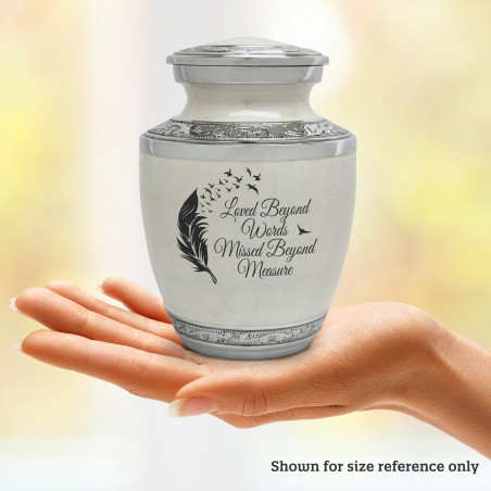 Select Loved Beyond Words Sharing Urn - Radiant White to create a personal memorial that is a step larger than a keepsake urn but more petite than a full size urn. Bold, attractive colors offer sharp contrast with the engraved text and detailed artwork.
