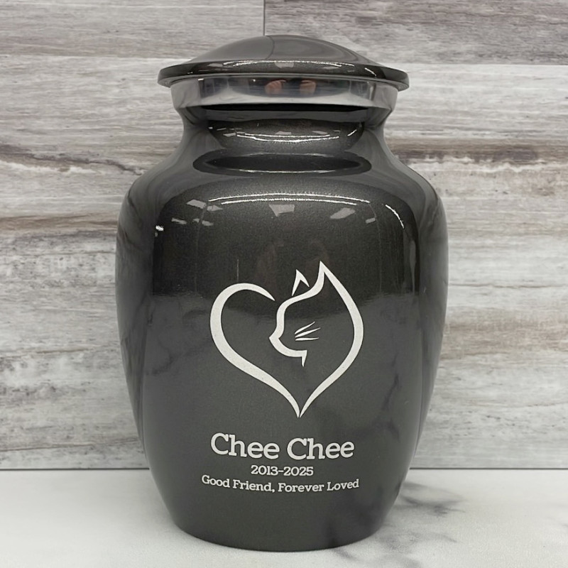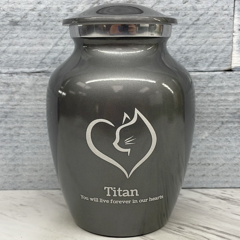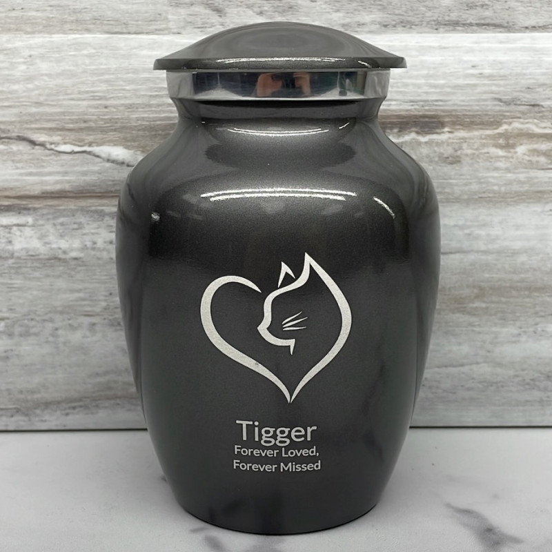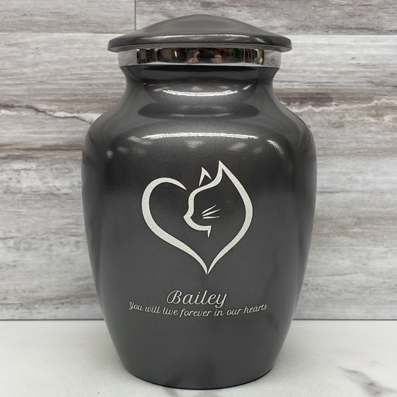 The Small Gunmetal Gray Loving Cat Pet Cremation Urn is an attractive and meaningful way to pay tribute to your pet who has passed on. Optional engraving features a name line and two additional lines that can include dates or sentiment lines. Choose from our most popular sentiments, customize them or enter your own text to make it completely unique.