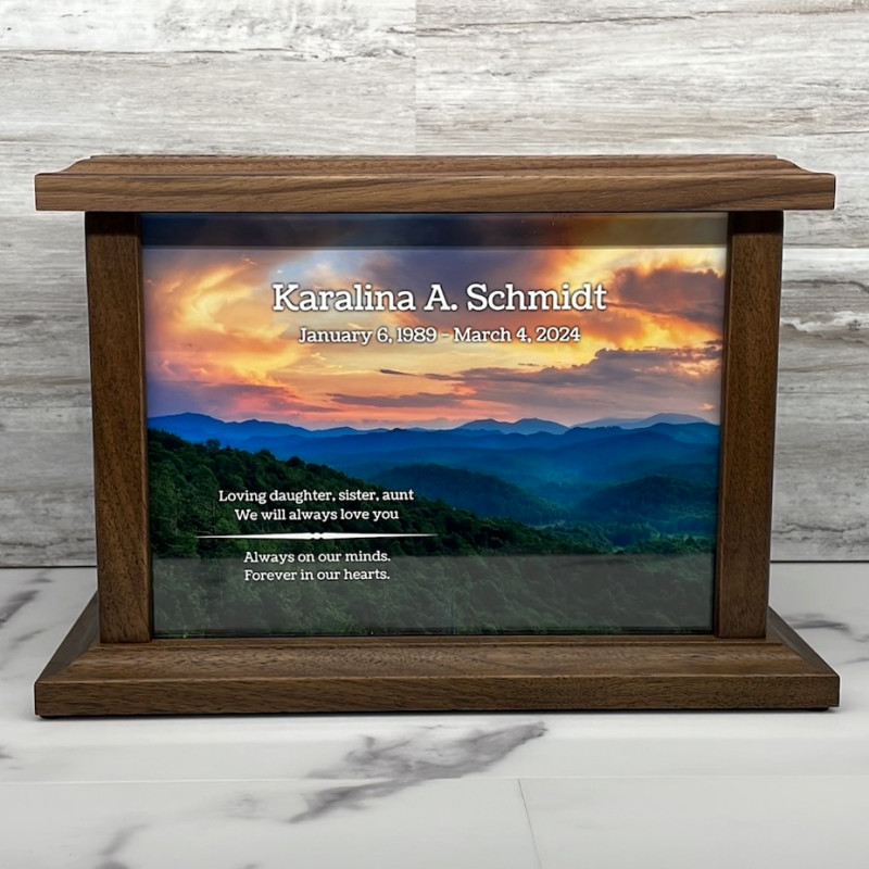 Choose this Shamrock Green Loving Hearts Cremation Urn to receive an attractive memorial that is engraved with beautiful overlapping hearts artwork. To create a truly custom memorial choose to optionally add a name, dates and multiple sentiment lines. The back of the urn is a canvas that is available as well, with choices from our most popular poems and bible verses or your own custom text.