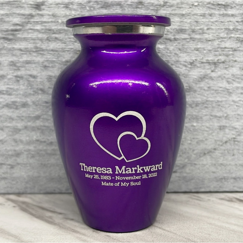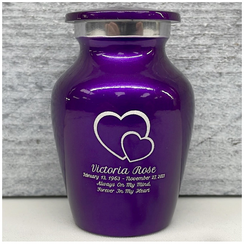 The Purple Luster Loving Hearts Keepsake Cremation Urn is a beautiful way to memorialize your loved one with beautiful heart artwork. Optional engraving that includes names, dates and up to three sentiment lines allows for this personal urn to become completely customized for you, your family or your beloved close friends.