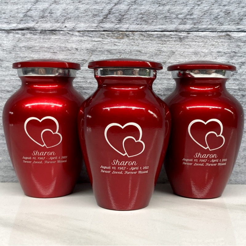 Loving Hearts Keepsake Urn - Midnight Blue Loving Hearts Keepsake Urn - Gunmetal Gray Loving Hearts Keepsake Urn - Purple Luster Loving Hearts Keepsake Urn - Shamrock GreenLoving Hearts Keepsake Urn - Ruby Red