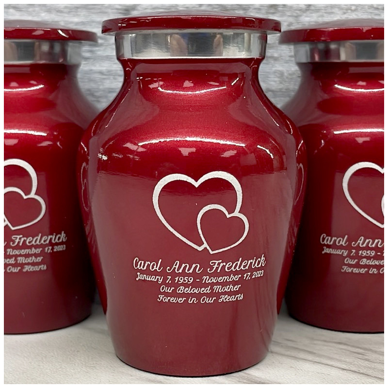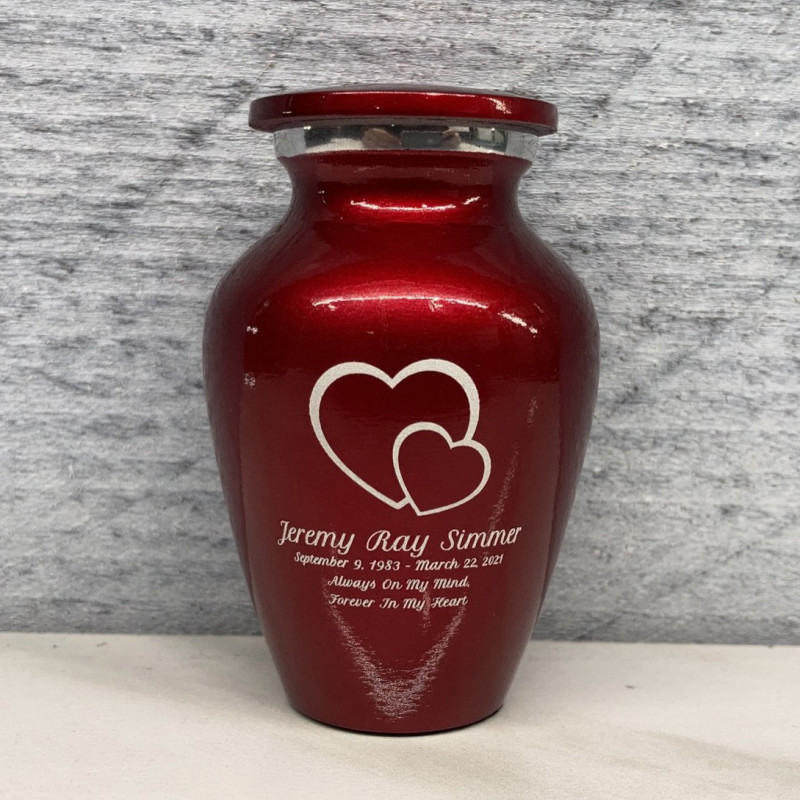 The Ruby Red Loving Hearts Keepsake Cremation Urn is a handsome personal memorial that honors your loved one with engraved heart artwork. Inspired by beautiful automotive colors, the Ruby Red color combined with an attractive and clear heart artwork and optional custom engraving creates an unique keepsake for family members and close friends that can be treasured for years to come.