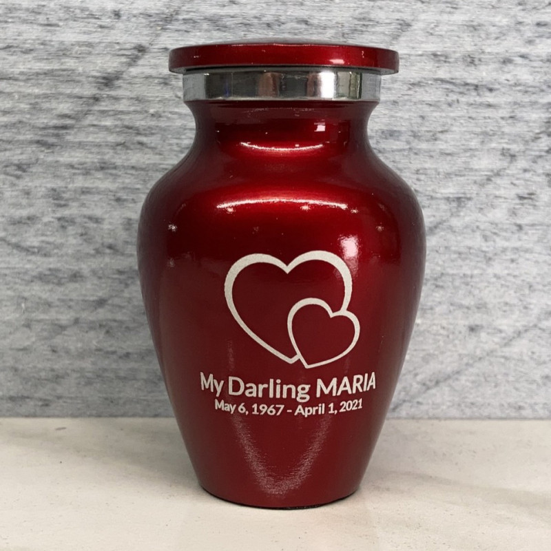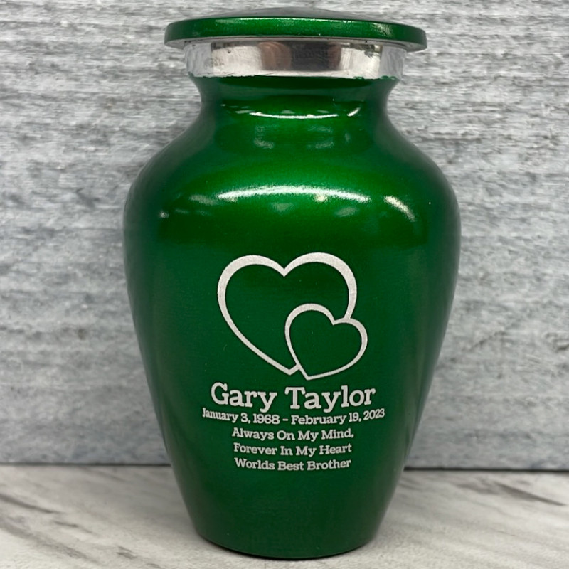 The Shamrock Green Loving Hearts Keepsake Cremation Urn is a beautiful and touching way to keep the memories of a loved one close. Clearly engraved overlaid hearts along with optional engraving that includes a name line, date line and three lines for sentiments allows for the creation of completely custom personal memorials for yourself, family or close friends.