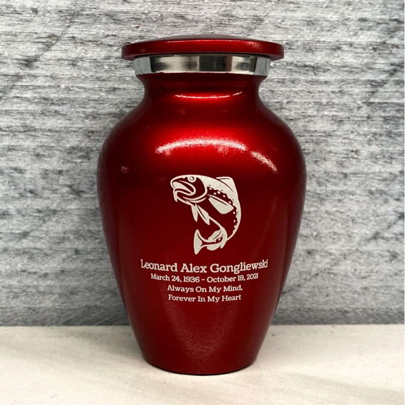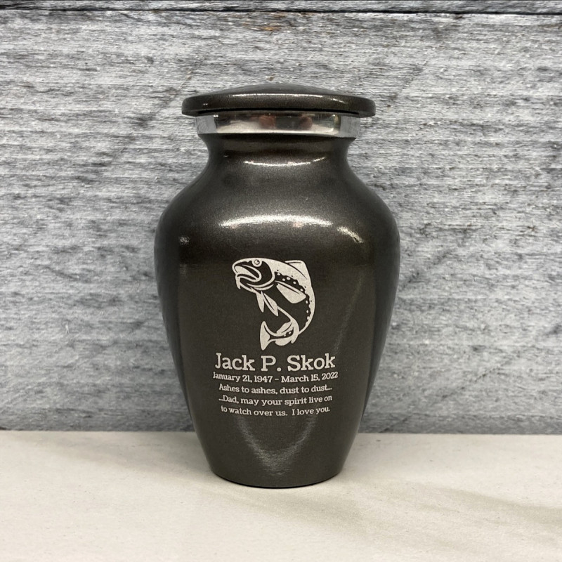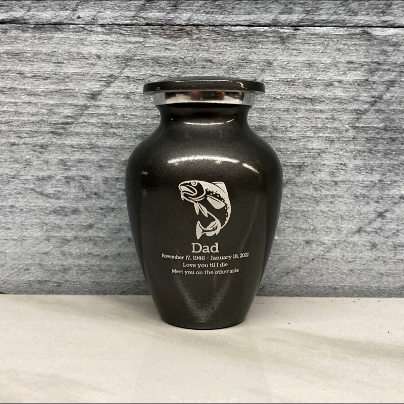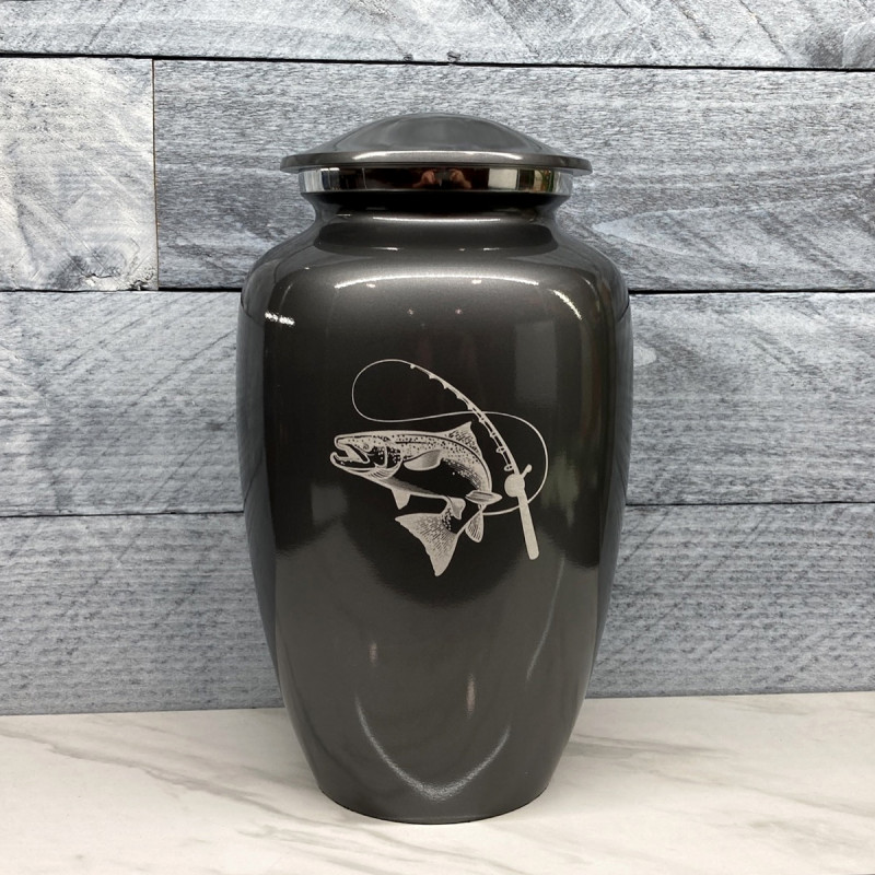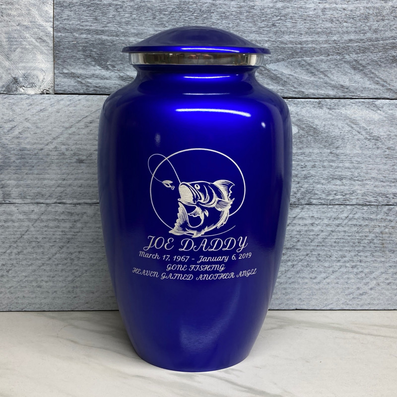 The Midnight Blue Lure Hit Fishing Sharing Cremation Urn celebrates the electric feeling of a fish hitting a lure. It's an outstanding value that allows everyone in the family to have a memorial of their own. Optional engraving front and back there are many ways to make the urn unique to your loved one. A threaded lid and felt base ensure it securely closes and protects display surfaces.