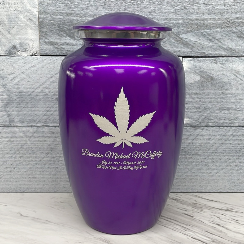 Our Marijuana Urn in Purple Luster showcases the marijuana leaf artwork with our Purple Luster metal urn. The rich purple color has been embellished with a metallic finish.