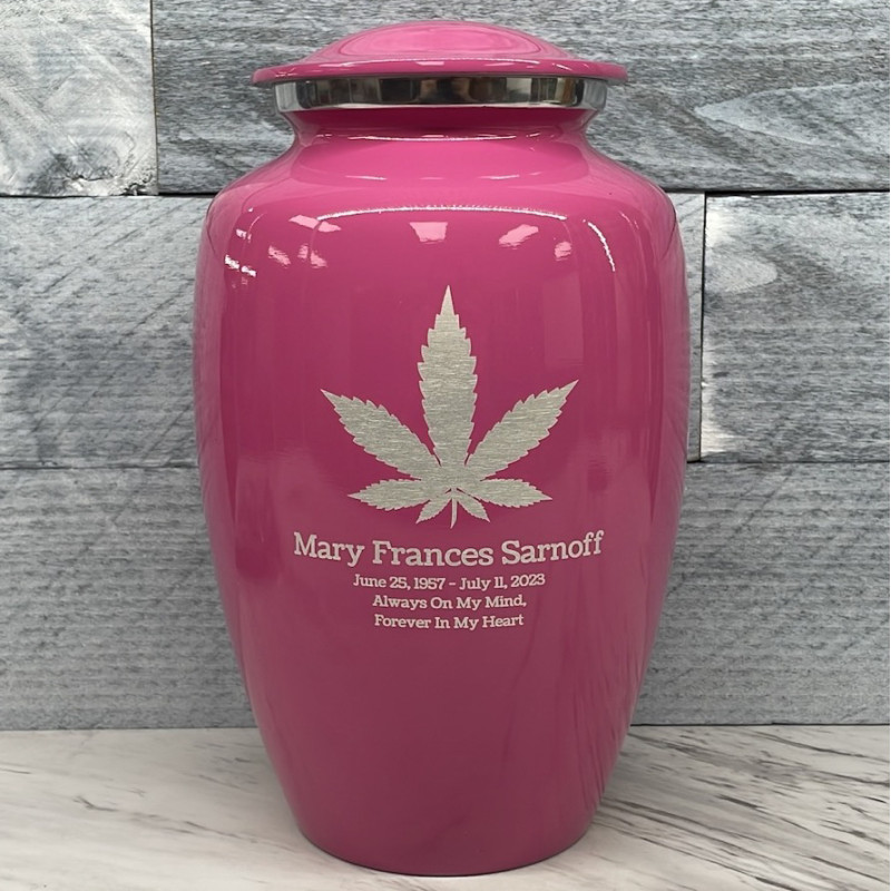 Choose a Marijuana Cremation Urn to create a beautiful memorial that is sized to hold the entire remains of any adult. Bold, attractive colors offer sharp contrast with the engraved text and detailed artwork.