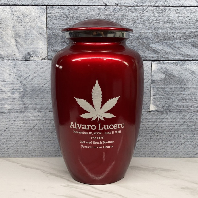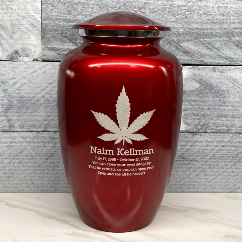 Remember all the great times spent with your loved one with the Ruby Red Marijuana urn. The engraved marijuana leaf artwork can be joined with the name, dates and multiple lines of optional sentiment text. Include more text, serious or not so serious, on the back with offered poems or your using your own words.