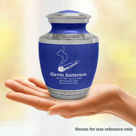 Select Marijuana Joint Sharing Urn - Royal Blue to create a personal memorial that is a step larger than a keepsake urn but more petite than a full size urn. Bold, attractive colors offer sharp contrast with the engraved text and detailed artwork.