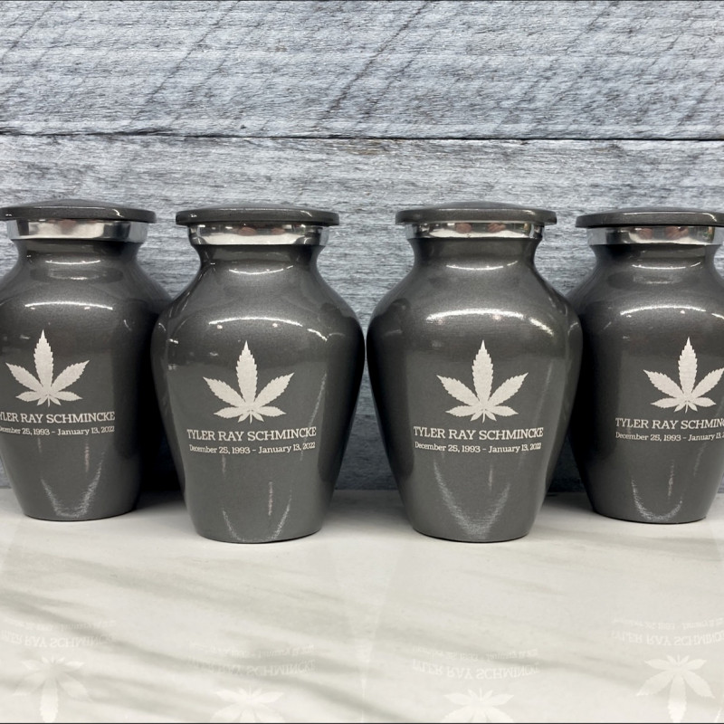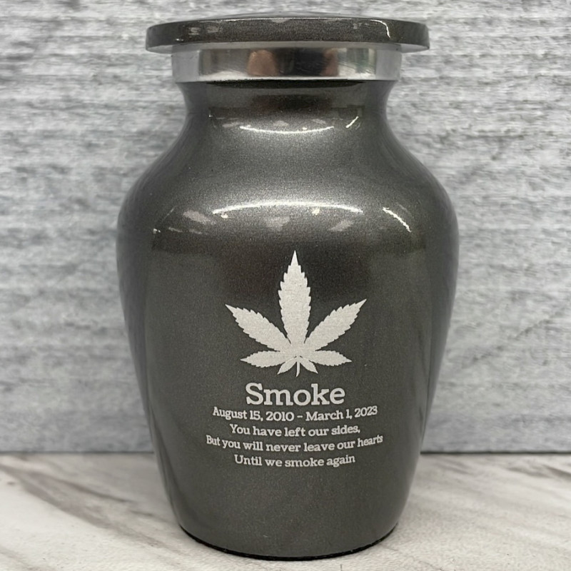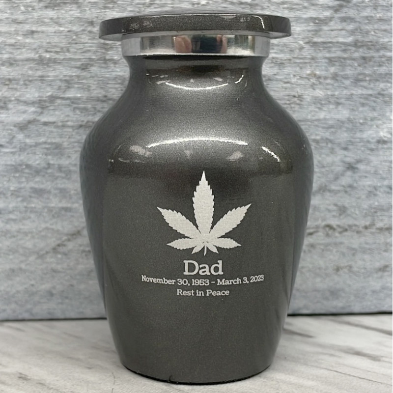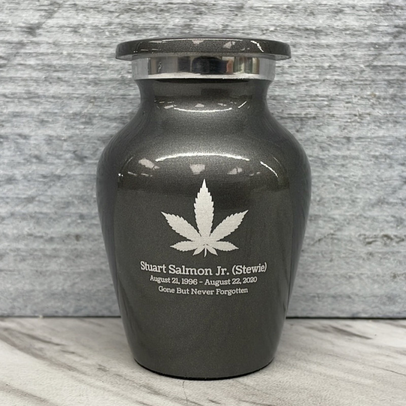 The Gunmetal Gray Marijuana Keepsake Cremation Urn is handsome and crafted with care. Each family member can keep their own memorial close with an affordable and engravable keepsake urn.